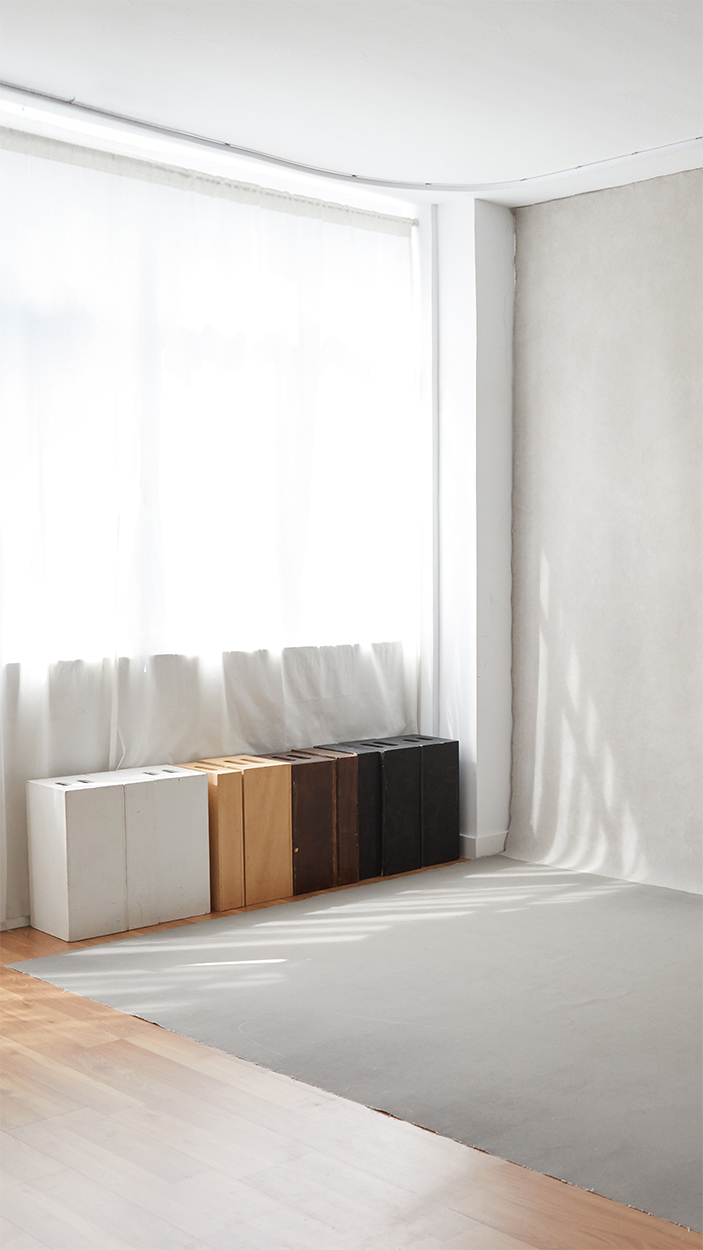 En el otro lado, se encuentra mi mesa donde  trabajo y hacemos la selección de retratos de tu sesión. El resto del estudio es una zona abierta cuyas dos paredes están cubiertas de fondos fotográficos. Una pared es completamente blanca y la pared opuesta tiene un fondo pintado gris verdoso con textura media y otro beige con textura suave.